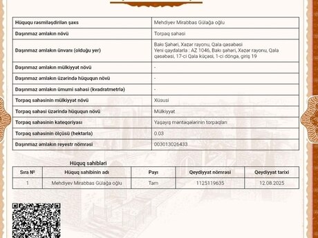 Sənəd çıxarış (kupça). Xüsusi mülkiyyət. Evin çox işləri görülüb. Bu ərazidə bu qiymətə belə ev yoxdu. Real alıcıya qiymətdə endirim olacaq. Ev 146 kv, torpaq isə ümumi 3 sotdur. Evdə 3 yataq otağı , 1 böyük zal, mətbəx, hamam tualet giriş balkon və koridordan ibarətdi. Ev şəkildə göründüyü kimidi. Kimin əlavə nə sualı varsa buyursun. Maklerlər zəng etməsin xahiş edirəm. Barter mümkündü. Sənəd torpağın çıxarışı dı. Evə çıxarış almaq üçün ev tam hazır vəziyyətdə olmalıdı. Ev hazır olandan sonra müraciət edib asanlıqla almaq olar.