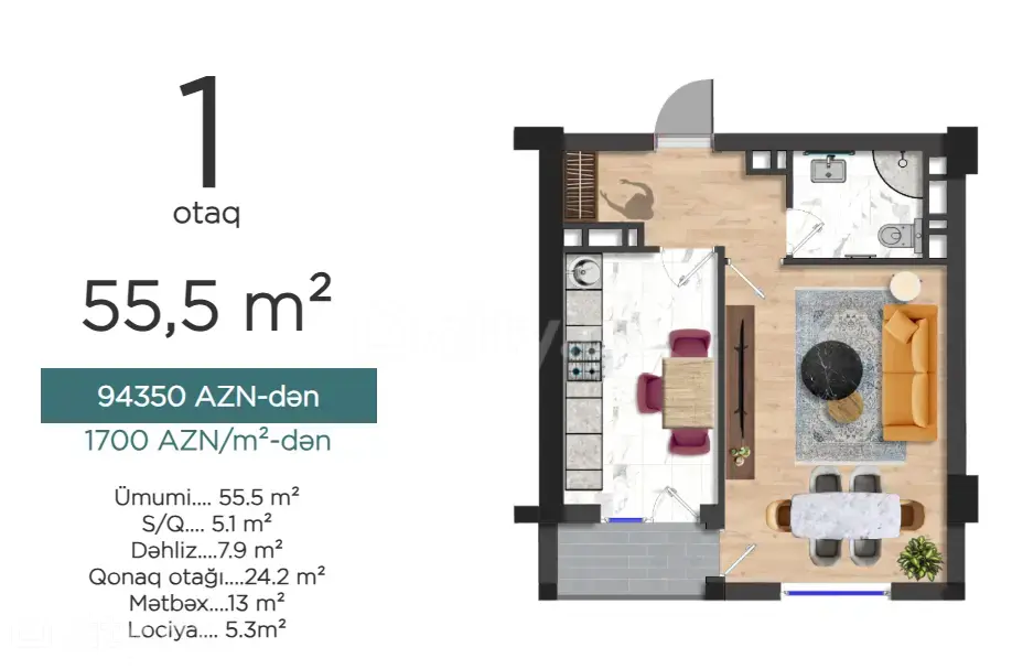 Şəhərin iri layihələrindən biri olan Binəqədi Park yaşayış kompleksində (keçmiş Bünyad Sərdarov zavodunun ərazisi) ümumi sahəsi 55,5 kv.m olan, təmirsiz (podmayak) 1 otaqlı mənzilimi satıram. Mənzili studio mətbəx konsepti ilə 2 otağa çevirmək mümkündür. Binaların tikintisi artıq yekunlaşıb, hazırda abadlıq işləri aparılır. Bina mart ayında sakinlər üçün təmirə təhvil veriləcək. Sənəd - şirkət müqaviləsi.